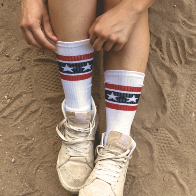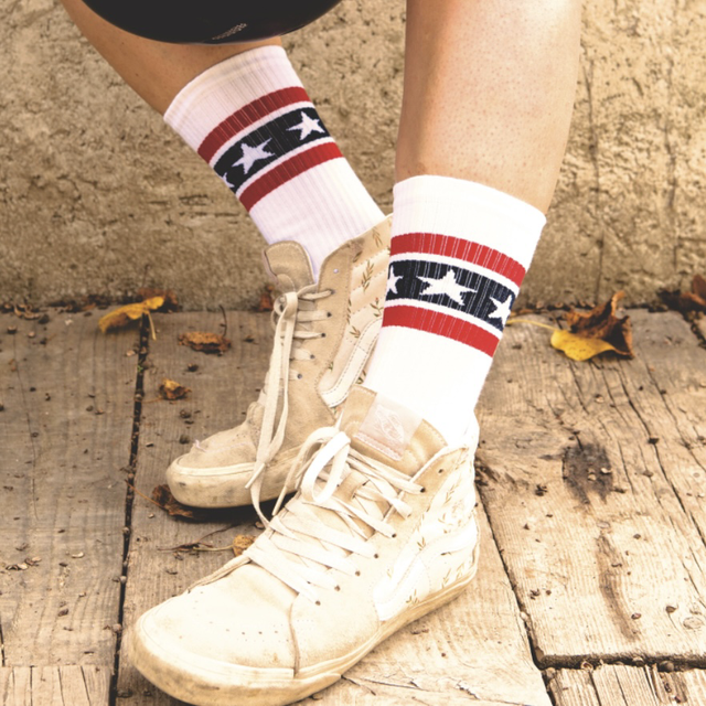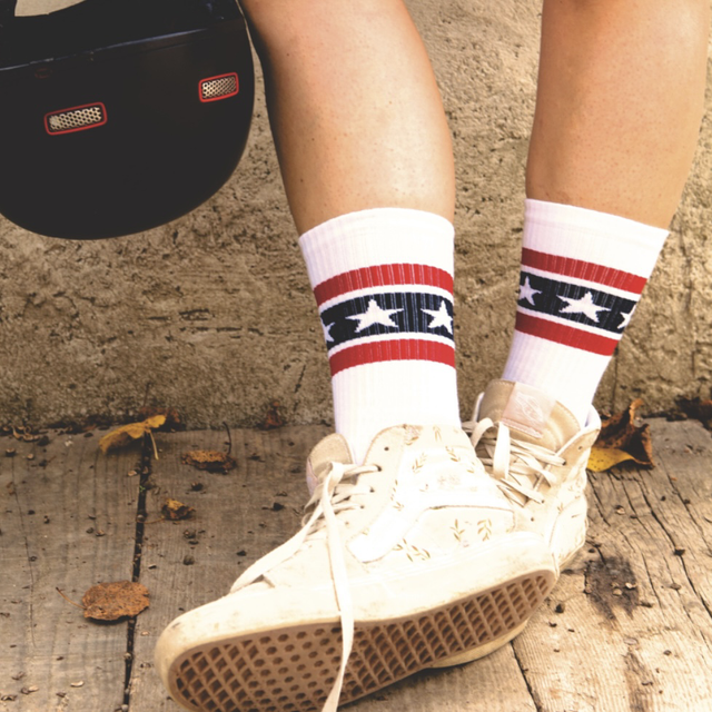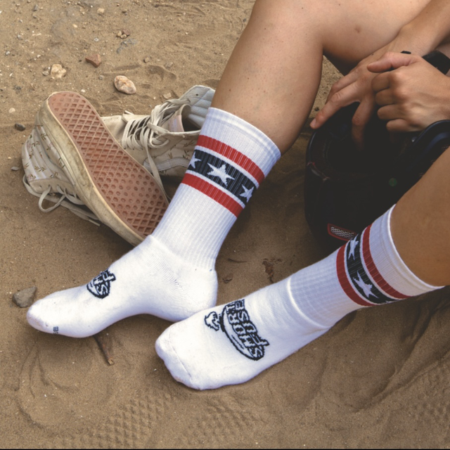 Une paire de chaussettes au design très américain, c’est ce qu’il fallait pour accompagner la sortie du hors série du magazine Bicross dédié à l’événement vintage devenu culte « Le BOMD » à Montdoumerc.